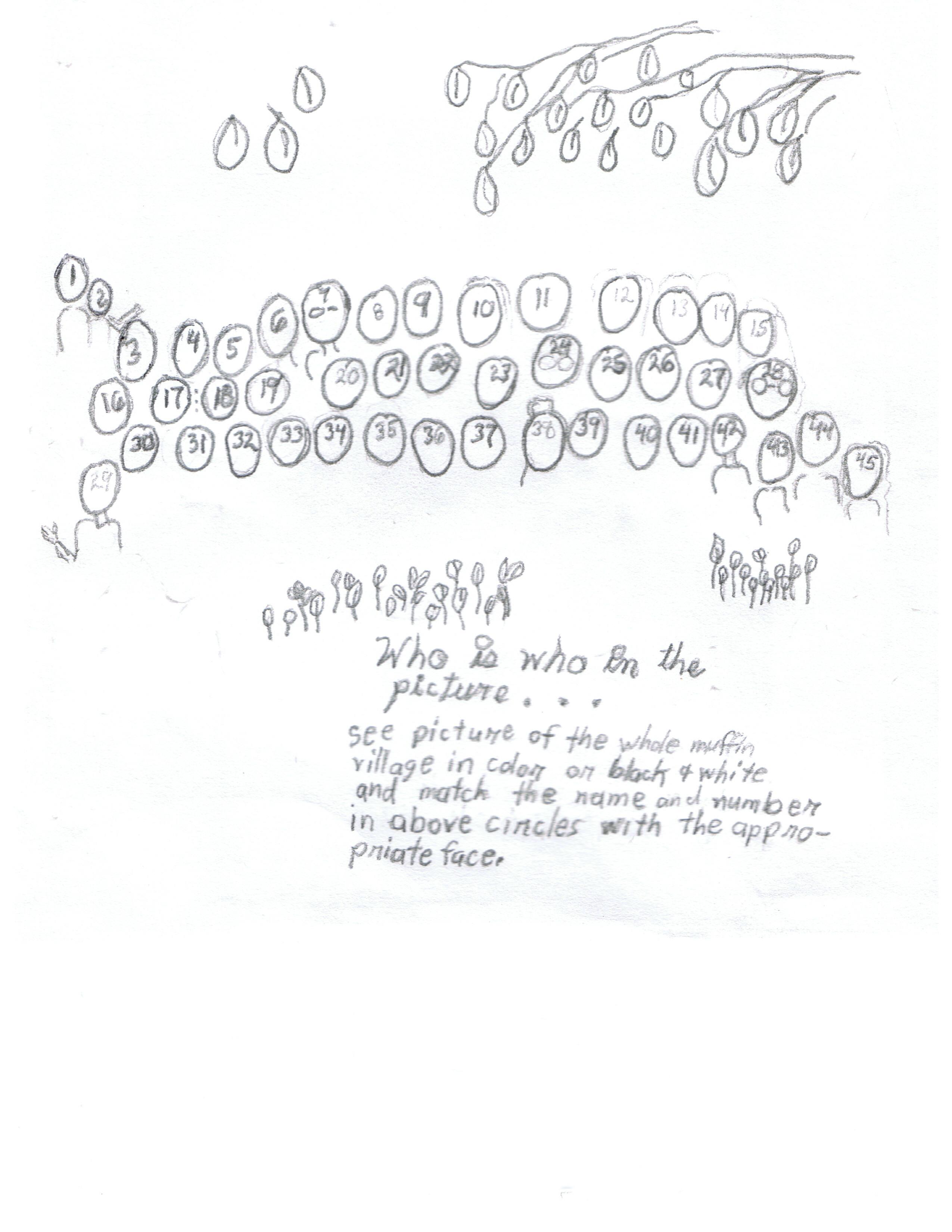When I drew this picture of the 45 muffin children of the muffin villages, I thought...I must name these children. Well, I had names for several of them as noted in my MUFFIN STORIES, but I needed names for the others in case anyone asks...what are their names. I employed family members to assist me with naming each young muffin. Go the picture and view the picture, then press the return button back to this page. The children are named in order from the very back top row from left to right. It will begin with the first female on the top back row and end with female on the first row on the far right. Black & White PICTURE |